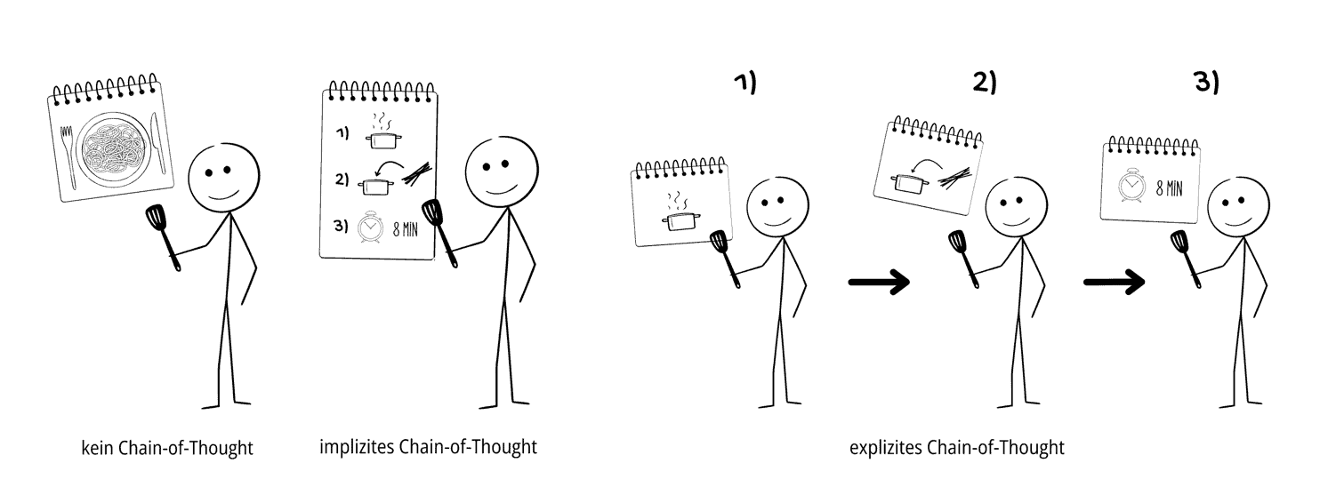 Zur Einordnung unterscheiden wir im Folgenden drei Varianten: Ohne Chain-of-Thought, bei der das Modell lediglich das Endergebnis erzeugt; implizites Chain-of-Thought, bei dem ein einzelner Agent mehrere notwendige Zwischenschritte intern nacheinander ausführt; sowie explizites Chain-of-Thought, wobei mehrere hintereinandergeschaltete Agenten jeweils einen klar abgegrenzten Arbeitsschritt übernehmen. Diese drei Varianten sind an der Analogie eines Kochrezepts illustriert: