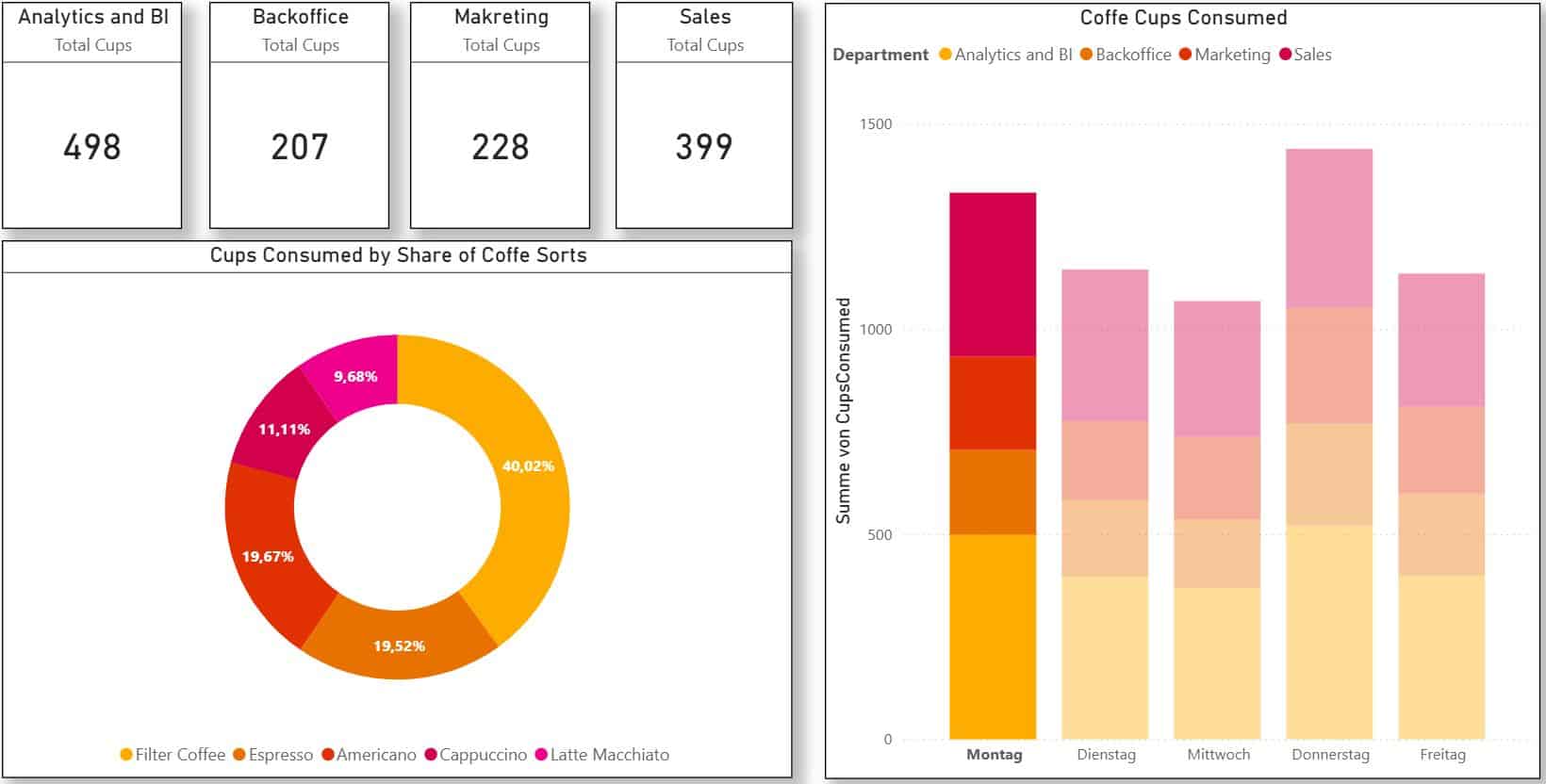 Selbst ein augenzwinkerndes Thema wie Büro-Kaffee zeigt, wie leistungsfähig Power BI in Datenmodellierung, Berechnungslogik und interaktiver Analyse ist. Aus Konsumdaten werden strukturierte Insights – und aus Kaffee wird BI mit Mehrwert.